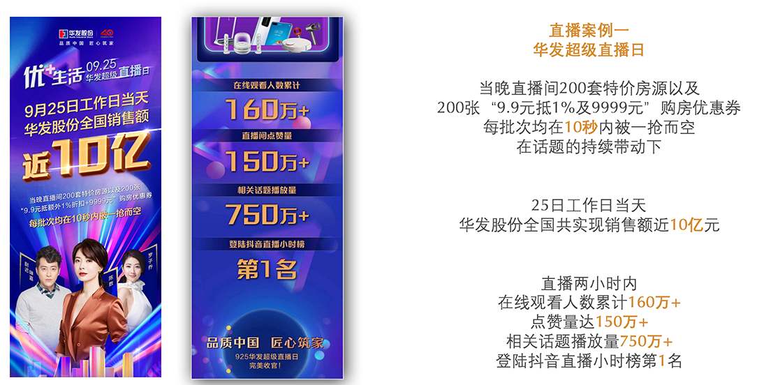 步入三季度末,房企纷纷加快营销节奏,不仅折扣力度有所加大、方式也开始多样化,不少房企借助直播、跨界联盟、“造节”等方式抢收“金九银十”。华发股份也是其中的一员:紧随品牌焕新发布会其后,在抖音直播平台精心策划了一场“华发超级直播日”活动。最终直播取得了亮眼的成绩,并引起了行业的关注。